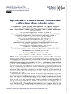 Hayman, G. D., Comyn-Platt, E., Huntingford, C., Harper, A. B., Powell, T., Cox, P. M., Collins, W. J. ORCID: https://orcid.org/0000-0002-7419-0850, Webber, C., Lowe, J. A., Sitch, S., House, J. I., Doelmann, J. C., van Vuuren, D. P., Chadburn, S. E., Burke, E. J. and Gedney, N. (2021) Regional variation in the effectiveness of methane-based and land-based climate mitigation options. Earth System Dynamics Discussions, 12 (2). pp. 513-544. ISSN 2190-4987 doi: 10.5194/esd-12-513-2021