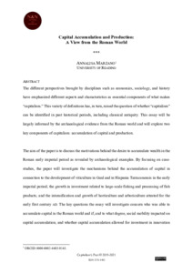The different perspectives brought by disciplines such as economics, sociology, and history have emphasized different aspects and characteristics as essential components of what makes “capitalism.” This variety of definitions has, in turn, raised the question of whether “capitalism” can be identified in past historical periods, including classical antiquity. This essay is largely informed by the archaeological evidence from the Roman world and explores two key components of capitalism: accumulation of capital and production. The aim of the paper is to discuss the motivations behind the desire to accumulate wealth in the Roman early imperial period as revealed by archaeological examples. By focusing on case-studies, the chapter investigates the mechanisms behind the accumulation of capital in connection to the development of viticulture in Gaul and in Hispania Tarraconensis in the early imperial period; the growth in investment related to large-scale fishing and processing of fish products; and the intensification and growth of horticulture and arboriculture attested for the early first century AD. The key questions the essay investigates concern who was able to accumulate capital in the Roman world and if, and to what degree, social mobility impacted on capital accumulation; and whether capital accumulation allowed for investment in innovation and improvements in production or was largely used for conspicuous consumption, which characterized the highly competitive behavior of the Roman elite.
