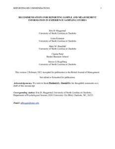 Heggestad, E. D. ORCID: https://orcid.org/0000-0001-7626-6700, Kreamer, L., Hausfeld, M. M., Patel, C. and Rogelberg, S. G. (2022) Recommendations for reporting sample and measurement information in experience sampling studies. British Journal of Management, 33 (2). pp. 553-570. ISSN 1467-8551 doi: 10.1111/1467-8551.12489