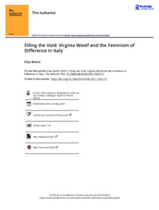 Bolchi, E. (2021) Filling the void: Virginia Woolf and the feminism of difference in Italy. The Italianist, 41 (1). pp. 97-115. ISSN 1748-619X doi: 10.1080/02614340.2021.1922177