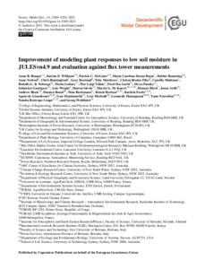 Harper, A. B., Williams, K. E., McGuire, P. ORCID: https://orcid.org/0000-0001-6592-4966, Duran Rojas, M. C., Hemming, D., Verhoef, A. ORCID: https://orcid.org/0000-0002-9498-6696, Huntingford, C., Rowland, L., Marthews, T., Eller, C. B., Mathison, C., Nobrega, R., Gedney, N., Vidale, P. L. ORCID: https://orcid.org/0000-0002-1800-8460, Otu-Larbi, F., Panday, D., Garrigues, S., Wright, A., Slevin, D., De Kauwe, M. G., Blyth, E., Ardö, J., Black, A., Bonal, D., Buchmann, N., Burban, B., Fuchs, K., de Grandcourt, A., Mammarella, I., Merbold, L., Montagnani, L., Nouvellon, Y., Restrepo-Coupe, N. and Wohlfahrt, G. (2021) Improvement of modelling plant responses to low soil moisture in JULESvn4.9 and evaluation against flux tower measurements. Geoscientific Model Development, 14 (6). pp. 3269-3294. ISSN 1991-9603 doi: 10.5194/gmd-2020-273