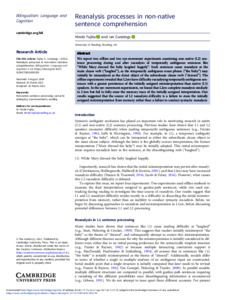 We report two offline and two eye-movement experiments examining non-native (L2) sentence processing during and after reanalysis of temporarily ambiguous sentences like “While Mary dressed the baby laughed happily”. Such sentences cause reanalysis at the main clause verb (“laughed”), as the temporarily ambiguous noun phrase (“the baby”) may initially be misanalysed as the direct object of the subordinate clause verb (“dressed”). The offline experiments revealed that L2ers have difficulty reanalysing temporarily ambiguous sentences with a greater persistence of the initially assigned misinterpretation than native (L1) speakers. In the eye-movement experiments, we found that L2ers complete reanalysis similarly to L1ers but fail to fully erase the memory trace of the initially assigned interpretation. Our results suggested that the source of L2 reanalysis difficulty is a failure to erase the initially assigned misinterpretation from memory rather than a failure to conduct syntactic reanalysis.