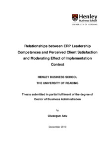Adu, O. (2020) Relationships between ERP leadership competences and perceived client satisfaction and moderating effect of implementation context. DBA thesis, Henley Business School, University of Reading. doi: 10.48683/1926.00097751