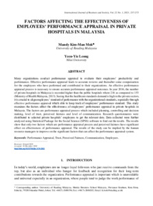 Mok Kim Man, M. and Yie Yeen, L. (2021) Factors affecting the effectiveness of employees’ performance appraisal in private hospitals in Malaysia. International Journal of Business and Society, 22 (1). pp. 257-275. ISSN 1511-6670 doi: 10.33736/ijbs.3174.2021