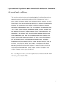 The transition out of university can be a challenging time for undergraduate students, especially those with mental health conditions (MHC). Student mental health is a global concern, and metrics indicate lower employment rates for graduates with MHC. Little is known about the expectations and experiences of these students regarding this transition. This research used mixed methods to gather information on transition expectations prior to graduation (Study One), and experiences after graduation (Study Two). In Study One, 44 final year undergraduate students with MHC registered with their disability service and 50 without completed a survey, examining emotions and expectations of the transition. Study Two involved semi-structured interviews with seven graduates with MHC. Study One found students with MHC associated more negative emotions with the transition and were less likely to have a post-graduation plan but were not accessing more support than those without MHC. Study Two highlighted challenges faced when accessing support, the impact of mental health on transitions, and coping with change. These findings have implications for Higher Education providers in ensuring better support is available for the transition out of university for students with MHC. Specific support tailored to the needs of these students could help improve graduate outcomes.