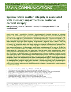 Overman, J. M., Zamboni, G., Butler, C. and Ahmed, S. ORCID: https://orcid.org/0000-0002-5528-1319 (2021) Splenial white matter integrity is associated with memory impairments in posterior cortical atrophy. Brain Communications, 3 (2). ISSN 2632-1297 doi: 10.1093/braincomms/fcab060