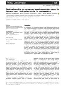 Diaz Restrepo, A., Balcombe, K., Fraser, I. M., Smith, R. J. and Verissimo, D. (2022) Testing branding techniques on species common names to improve their fundraising profile for conservation. Animal Conservation, 25 (1). pp. 27-37. ISSN 1367-9430 doi: 10.1111/acv.12715
