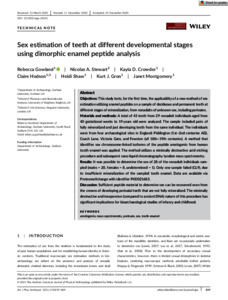 Objectives: This study tests, for the first time, the applicability of a new method of sex estimation utilizing enamel peptides on a sample of deciduous and permanent teeth at different stages of mineralization, from nonadults of unknown sex, including perinates. Materials and methods: A total of 43 teeth from 29 nonadult individuals aged from 40 gestational weeks to 19 years old were analyzed. The sample included pairs of fully mineralized and just developing teeth from the same individual. The individuals were from four archaeological sites in England: Piddington (1st–2nd centuries AD), Coach Lane, Victoria Gate, and Fewston (all 18th–19th centuries). A method that identifies sex chromosome-linked isoforms of the peptide amelogenin from human tooth enamel was applied. The method utilizes a minimally destructive acid etching procedure and subsequent nano liquid chromatography tandem mass spectrometry. Results: It was possible to determine the sex of 28 of the nonadult individuals sam�pled (males = 20, females = 8, undetermined = 1). Only one sample failed (CL9), due to insufficient mineralization of the sampled tooth enamel. Data are available via ProteomeXchange with identifier PXD021683. Discussion: Sufficient peptide material to determine sex can be recovered even from the crowns of developing perinatal teeth that are not fully mineralized. The minimally destructive and inexpensive (compared to ancient DNA) nature of this procedure has significant implications for bioarchaeological studies of infancy and childhood.