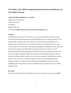 Hodson, C. M. ORCID: https://orcid.org/0000-0002-3408-2871 and Gowland, R. (2020) Like mother, like child: investigating perinatal and maternal health stress in post-medieval London. In: Gowland, R. and Halcrow, S. (eds.) The Mother-Infant Nexus in Anthropology. Bioarchaeology and Social Theory. Springer, pp. 39-64. ISBN 9783030273934 doi: 10.1007/978-3-030-27393-4