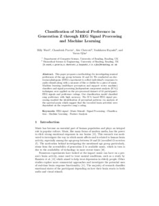 Ward, B., Pravin, C., Chetcuti, A., Hayashi, Y. and Ojha, V. ORCID: https://orcid.org/0000-0002-9256-1192 (2021) Classification of musical preference in generation Z through EEG signal processing and machine learning. In: International Conference on Intelligent Systems Design and Applications, 12-15 December 2020, https://link.springer.com/conference/isda, pp. 117-127. doi: 10.1007/978-3-030-71187-0_11