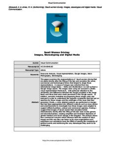 Albawardi, A. and Jones, R. H. ORCID: https://orcid.org/0000-0002-9426-727X (2023) Saudi women driving: images, stereotyping and digital media. Visual Communication, 22 (1). pp. 96-127. ISSN 1741-3214 doi: 10.1177/14703572211040851