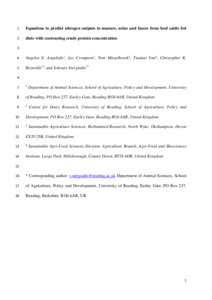 Equations to predict nitrogen outputs in manure, urine and faeces from beef cattle fed diets with contrasting crude protein concentration.
