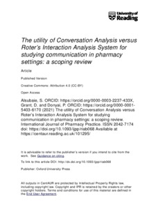 Alsubaie, S., Grant, D. and Donyai, P. ORCID: https://orcid.org/0000-0001-5403-6170 (2022) The utility of conversation analysis versus Roter’s interaction analysis system for studying communication in pharmacy settings: a scoping review. International Journal of Pharmacy Practice, 30 (1). pp. 17-27. ISSN 0961-7671 doi: 10.1093/ijpp/riab068
