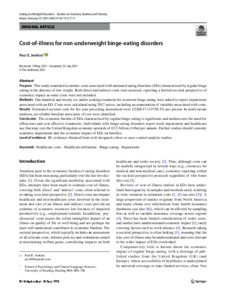 Purpose: This study examined economic costs associated with untreated eating disorders (EDs) characterised by regular binge eating in the absence of low weight. Both direct and indirect costs were assessed, reporting a limited societal perspective of economic impact as some costs were not included. Methods: One-hundred and twenty-six adults seeking treatment for recurrent binge eating were asked to report impairment associated with an ED. Costs were calculated using 2017 prices, including an examination of variables associated with costs. Results: Estimated societal costs for the year preceding assessment were £3268.47 (€3758.54) per person. In multivariate analyses, no reliable baseline associates of cost were identified. Conclusion: The economic burden of EDs characterised by regular binge eating is significant, and underscores the need for efficacious and cost-effective treatments. Individuals with binge-eating disorders report work impairment and healthcare usage that may cost the United Kingdom economy upwards of £3.5 billion (€4bn) per annum. Further studies should consider academic impairment and the economic impact of EDs on families.