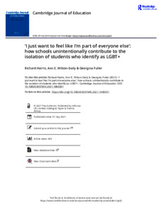 Harris, R. ORCID: https://orcid.org/0000-0001-8606-5515, Wilson-Daily, A. and Fuller, G. (2022) ‘I just want to feel like I’m part of everyone else.’ How schools unintentionally contribute to the isolation of students who identify as LGBT+. The Cambridge Journal of Education, 52 (2). pp. 155-173. ISSN 1469-3577 doi: 10.1080/0305764X.2021.1965091