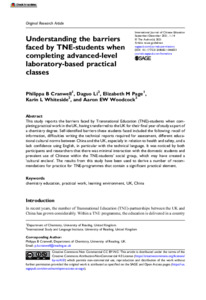 Cranwell, P. ORCID: https://orcid.org/0000-0001-7156-5576, Li, D., Whiteside, K. ORCID: https://orcid.org/0000-0002-7335-1085, Woodcock, A. and Page, E. (2021) Understanding the barriers faced by TNE-students when completing advanced-level laboratory-based practical classes. International Journal of Chinese Education, 10 (3). 221258682110460. ISSN 2212-5868 doi: 10.1177/22125868211046033